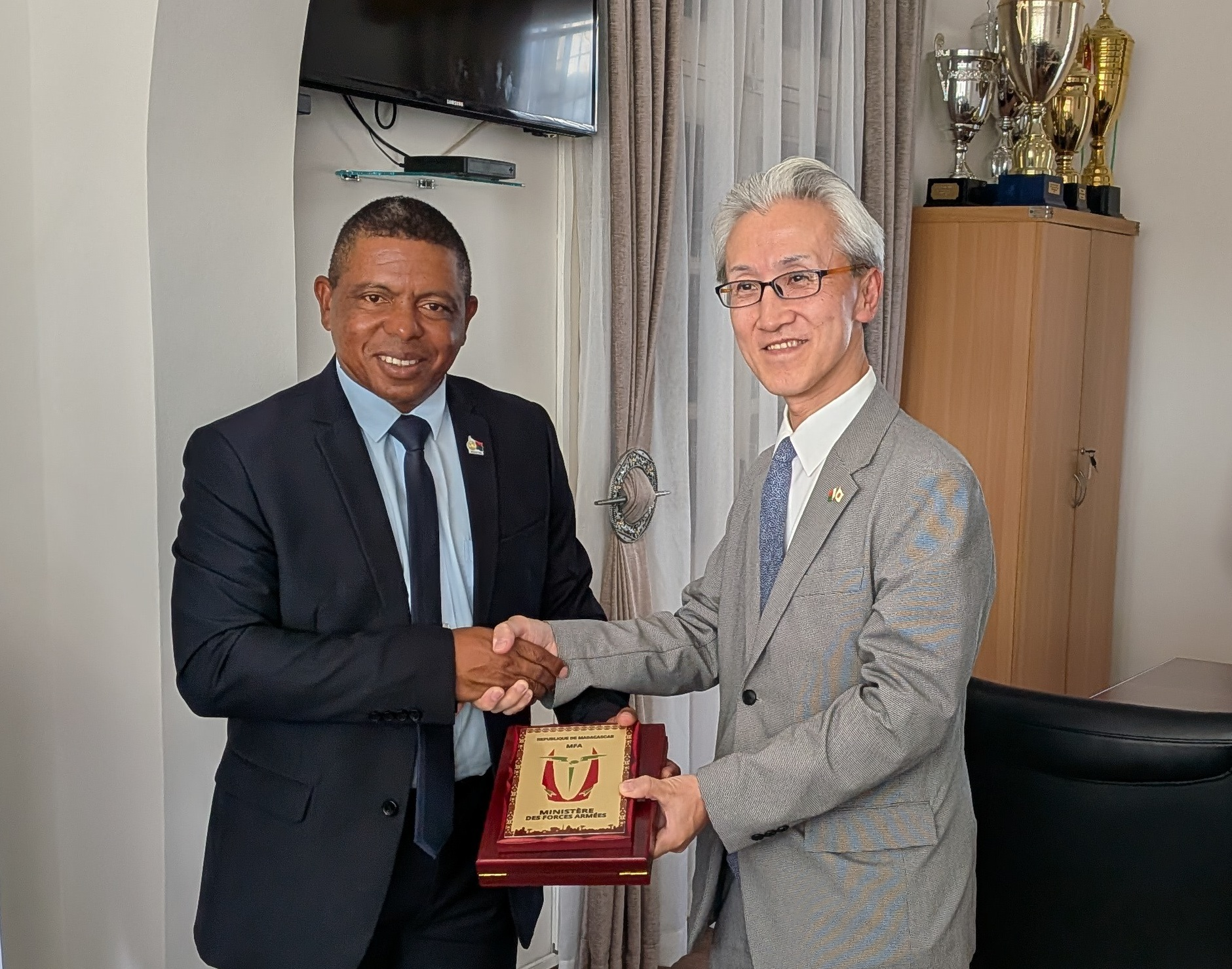 Le 5 mars, l'Ambassadeur TOJIMA a rendu une visite de courtoisie au Ministre des Forces Armées, S.E.M. le Général de Division RAZAFITOMBO Maminirina Ely, Ministre des Forces Armées.